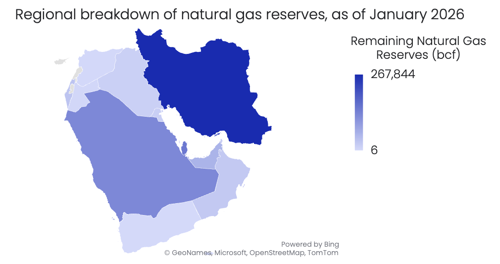 Gas remains the backbone of the power system, supported by substantial regional reserves estimated at around 695,000 billion cubic feet (bcf), with Iran accounting for roughly 270,000bcf.