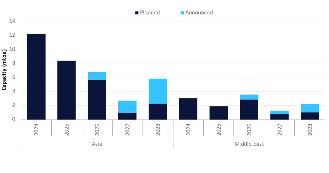 Asia is expected to add a capacity of 35.53mtpa from 57 new build, planned and announced projects. As for capacity expansions, the region is expected to add a capacity of 0.18mtpa from three planned projects.