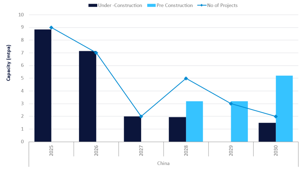 By 2030, there will be a total of 26 projects in China, which are projected to add an overall capacity of 33.03 million tonnes per annum (mtpa). Among these, 19 projects are currently under construction, with an estimated capacity addition of 21.43mtpa. The remaining 11.60mtpa capacity is expected to be added by seven projects in the pre-construction stage.
