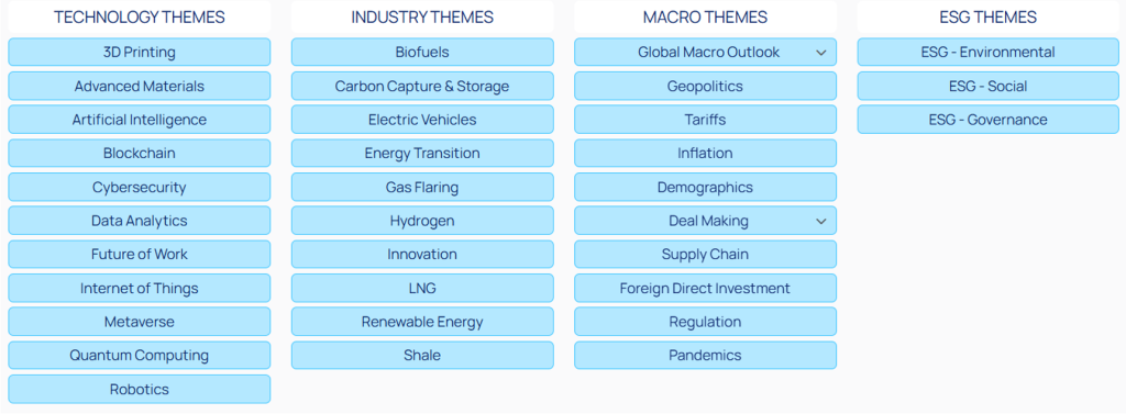 So, to help our clients gain a competitive advantage, GlobalData has developed its Strategic Intelligence Solution, a single, integrated global research platform that provides an easy-to-use framework for tracking all strategic issues—or themes—impacting all companies across all industries.