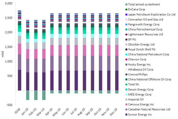 The mandate from the Alberta government is to reduce production by 325,000 barrel per day (b/d), from operators with crude oil production levels above 10,000b/d based on their highest six months of production in 2018. The expectation is for this curtailment of production to be achieved in three months freeing pipeline capacity to alleviate the glut. Once this is achieved the production cut will be lowered to 95,000b/d and if necessary the cut can remain enforceable throughout all 2019.