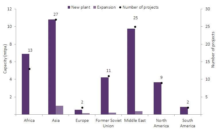 Global planned and announced ammonia capacity additions by region (mtpa)