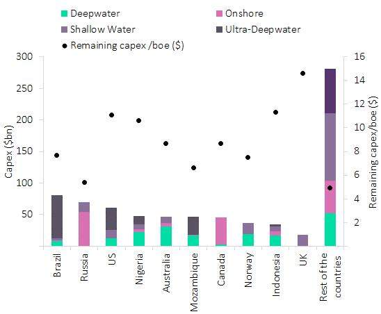 Nigeria, Australia, Mozambique, Canada, Norway, Indonesia, and the UK, together have a capex $277bn, or about 35.9% of the total capex spending on upcoming projects over the next eight years globally.