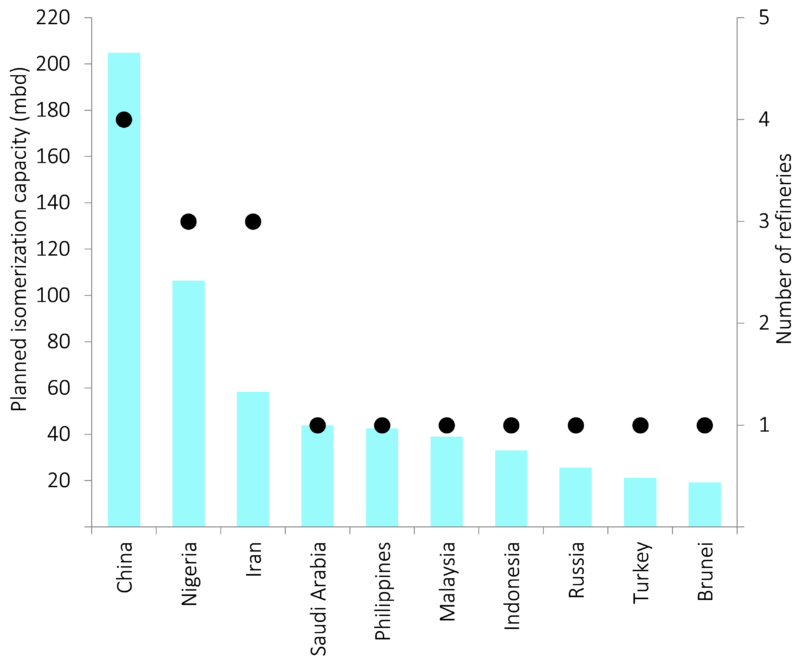 Russia, Turkey and Brunei collectively contribute about 66.2mbd to the global planned isomerization capacity in 2021, which is about 9% of the global total.