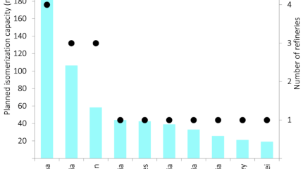 Russia, Turkey and Brunei collectively contribute about 66.2mbd to the global planned isomerization capacity in 2021, which is about 9% of the global total.