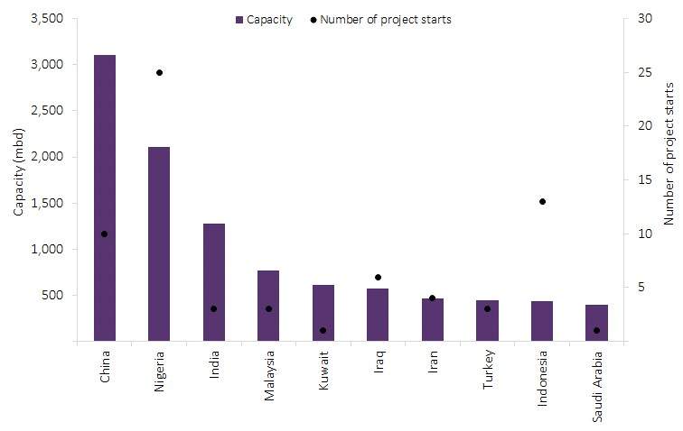 Nigeria is expected to add 2,106mbd of CDU capacity through 25 refineries by 2022. The country is also expected to spend $49.3bn in the next four years on the new build refineries. India is expected to witness the addition of 1,280mbd of CDU capacity by 2022, and capex of $72bn is expected to be spent over the next four years.