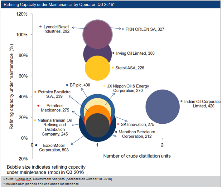 By GlobalDataThe report shows that BP plc (430 mbd), Indian Oil Corporation Limited (420 mbd) and PKN ORLEN SA (327 mbd) were the top three operators globally in terms of planned maintenance in the quarter. ExxonMobil Corporation (503 mbd), LyondellBasell Industries (292 mbd) and Petroleos Mexicanos (275 mbd) witnessed the most unplanned maintenance globally in Q3 2016.