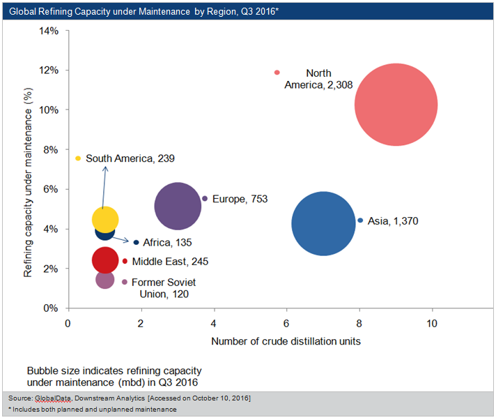 The new GlobalData report clearly indicates that North America had the highest refining capacity under maintenance globally, whether planned or unplanned, in Q3 2016.