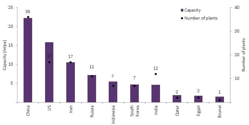 Global planned and announced ethylene capacity additions by top 10 countries (mtpa)