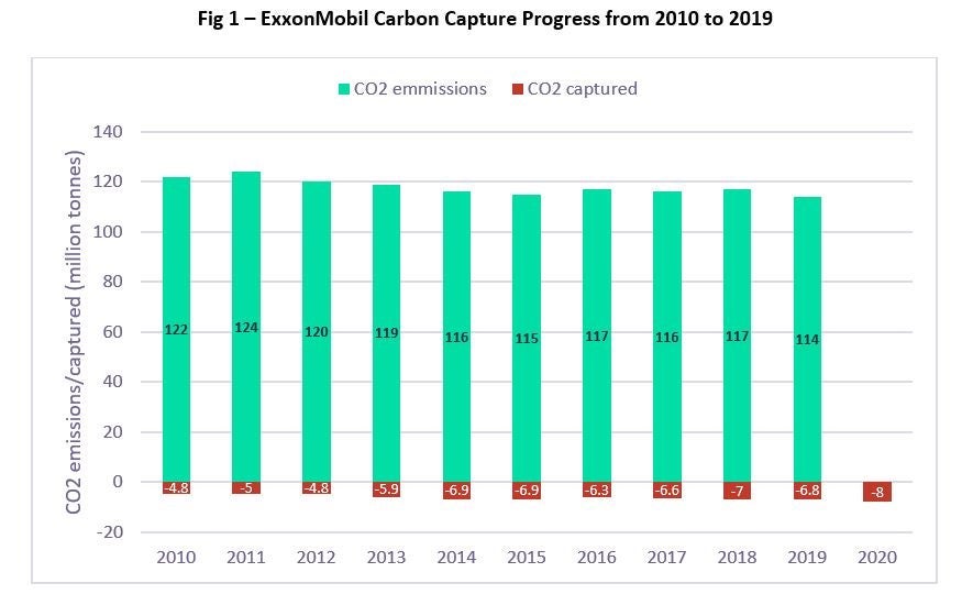 ExxonMobil has created a new business unit, Low Carbon Solutions, to focus on new Carbon Capture and Sequestration (CCS) opportunities to scale up the company’s initiative with partnerships discussed globally. The company is currently advancing up to 20 new plans with planned capital of $3bn through 2025. In 2019, carbon capture capacity in the US is standing at only 25 mtpa, which is merely 0.33% compared to up to 7500 mtpa emitted, which will require a great deal of effort to ramp up for future sustainability. The company reported that CCS is critical and cost-efficient to mitigate emission but is currently not on track to meet IEA Clean Energy Progress, capturing only 6% of the 114 million tonnes of carbon emitted in 2019.