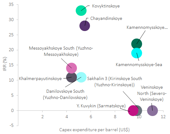 Average development break-even price for gas projects in Russia is about $1.30 per thousand cubic feet (mcf).  Shallow water projects require a gas price of $5.80 per mcf to break even, while onshore projects have a development break-even price of $1.10 per mcf.