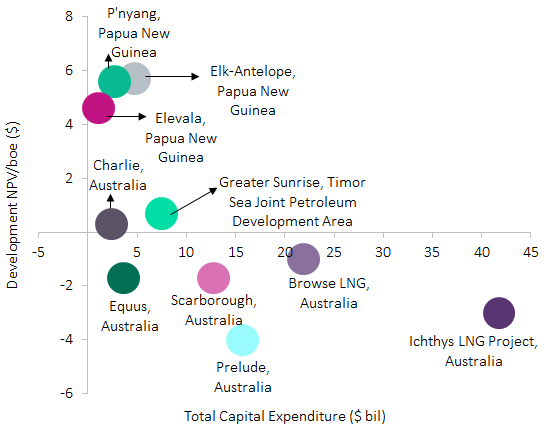The Ichthys LNG Project in Australia is the largest with anticipated peak production at 333,800 barrels of oil equivalent in 2020 at an estimated cost of $41.8bn. Browse LNG in Australia is the next largest project with an anticipated peak production at 172,200 barrels of oil equivalent in 2025 at an estimated cost of $21.9bn.