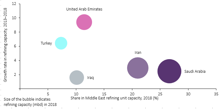 Saudi Arabia, Iran, United Arab Emirates, Iraq and Turkey are the key sector players, accounting for over 76.6 per cent of the total refining capacity of the region in 2018.