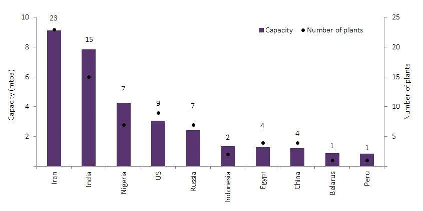 In the Middle East, Iran has 23 planned and announced ammonia plants, expected to start operations with total capacity of about 9.1mtpa by 2026. Capital expenditure (capex) for these plants totals $1.77bn over the next nine years. Major capacity additions will be from The National Petrochemical Company.