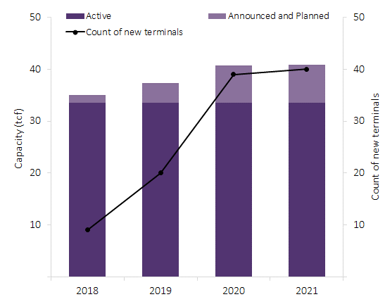 Turkey and Mexico together contribute about 2.2tcf, 6.4% of global LNG regasification capacity. An announced terminal in Turkey is expected to add a capacity of 0.2tcf during 2018 – 2021.