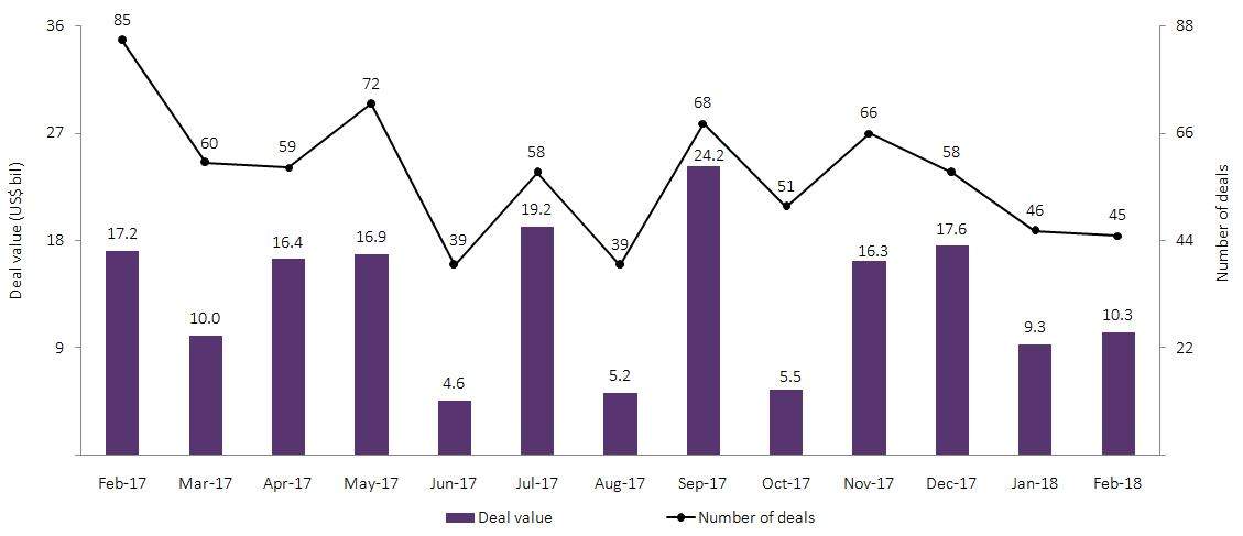 A year-on-year comparison shows a decline of 40% in deal value in February 2018, when compared to February 2017’s value of $17.2bn. The month recorded 12 capital raising deals with values greater than $100m, together accounting for $9.9bn.