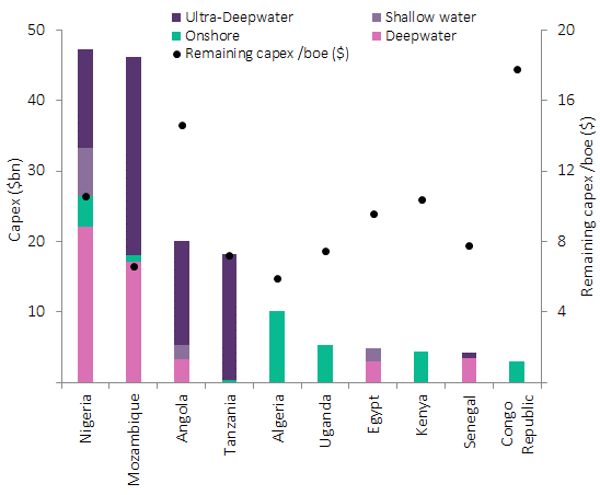 Upcoming ultra-deepwater projects in Africa will have the highest total capex at $212.1bn. Deepwater projects will require $80.9bn over the lifetime, while onshore and shallow water projects carry a total capex of $63.0bn and $26.8bn respectively.