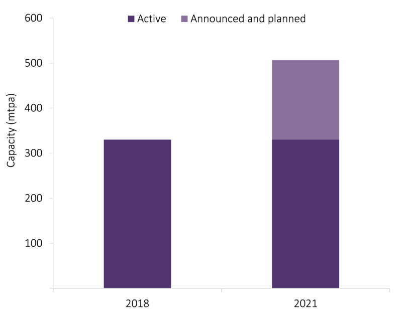 Russia contributes about 21mtpa, which is approximately 5.5% of the global LNG liquefaction capacity. Russia is expected to add a capacity of 3.1mtpa from four planned and announced terminals during 2018 – 2021.