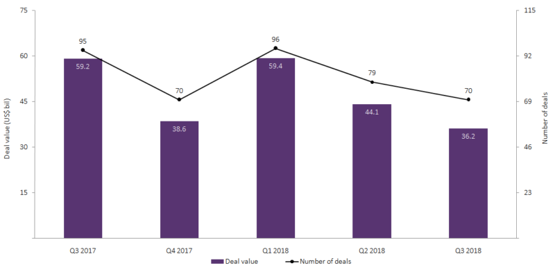 Capital raising, through debt offerings, witnessed a decrease of 21% in deal value, recording $27.7bn in Q3 2018, compared to $35bn in Q2 2018. Capital raising, through equity offerings, registered a significant increase of 76% in deal value, with $7.2bn in Q3 2018, compared with $4.1bn in Q2 2018. Further, four private equity/venture capital deals, with a combined value of $1.3bn, were recorded in Q3 2018, compared to six deals of a combined value of $5bn in Q2 2018.