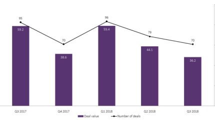 Capital raising, through debt offerings, witnessed a decrease of 21% in deal value, recording $27.7bn in Q3 2018, compared to $35bn in Q2 2018. Capital raising, through equity offerings, registered a significant increase of 76% in deal value, with $7.2bn in Q3 2018, compared with $4.1bn in Q2 2018. Further, four private equity/venture capital deals, with a combined value of $1.3bn, were recorded in Q3 2018, compared to six deals of a combined value of $5bn in Q2 2018.