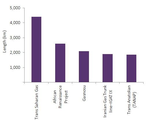 The second-longest planned pipeline is the African Renaissance Project pipeline, which starts in Mozambique and has a proposed length of 2,600km. The onshore gas pipeline is expected to start operations in 2021. China National Petroleum Corporation (20%), Empresa Nacional de Hidrocarbonetos EP (28%) and Profin Consulting Sociedade Anonima (28%) are its stakeholders. The pipeline involves total capex of $6bn.