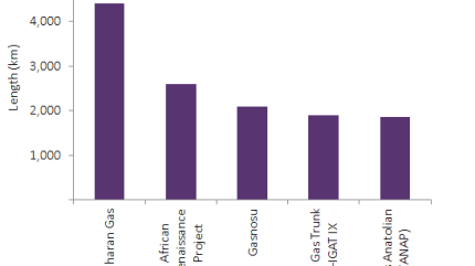 The second-longest planned pipeline is the African Renaissance Project pipeline, which starts in Mozambique and has a proposed length of 2,600km. The onshore gas pipeline is expected to start operations in 2021. China National Petroleum Corporation (20%), Empresa Nacional de Hidrocarbonetos EP (28%) and Profin Consulting Sociedade Anonima (28%) are its stakeholders. The pipeline involves total capex of $6bn.