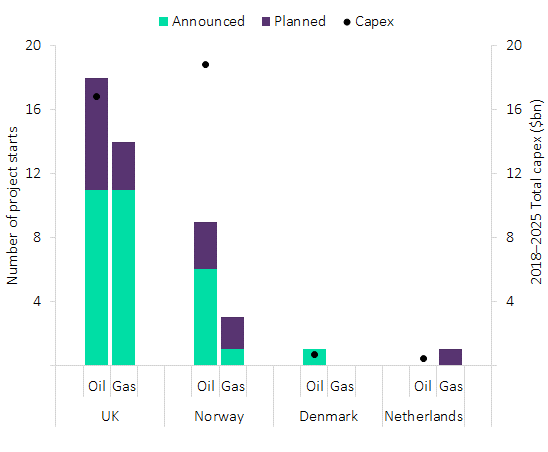 Among countries, Norway, the UK, and the Netherlands are expected to be the highest capex spenders on key planned projects with about $12.1bn, $7.9bn, and $400m, respectively, during 2018–2025. In early-stage projects, the UK leads with a capex of $8.9bn, followed by Norway with $6.8bn.