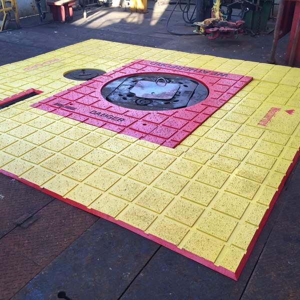 Available in various colours, the mats can incorporate hazard identification messages embedded within the surface of the mat, which is ideal for highlighting red zone areas on the rig floor.