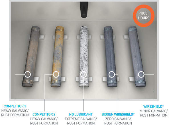 More than three years of research by industry-leading chemists at ROCOL has led to the development of BIOGEN WIRESHIELD. It is proven to excel in the most adverse environments, providing outstanding corrosion-resistance. It exhibited zero galvanic reaction after 1,000h in salt spray testing and offers shear stability in saltwater, showing excellent results and little degradation in testing.