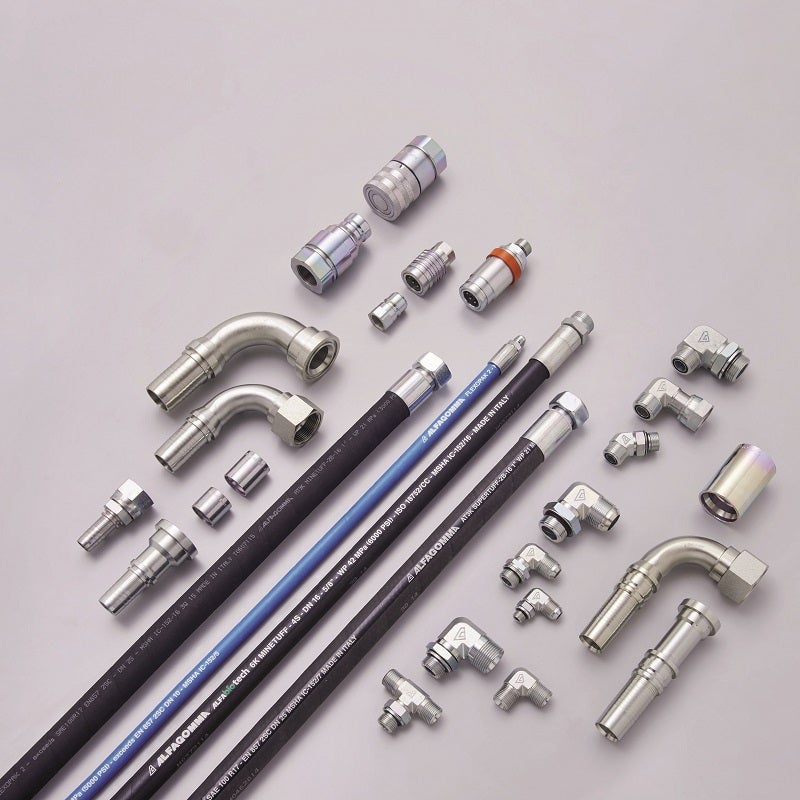 ALFAGOMMA hoses and fittings are designed to work perfectly together for the highest performances, as a sole problem-free system, no matter how the machine operates. ALFAGOMMA’s coupling designs and performances meet international standards such as those of BSP, DIN, SAE, JIC, NPTF and ORFS. On its couplings, ALFAGOMMA has introduced a special coating which is chromium VI free and has a salt spray test resistance of up to 400hr. In the wide and complete range one-piece (alfacrimp) and stainless-steel fittings and adapters are also included.