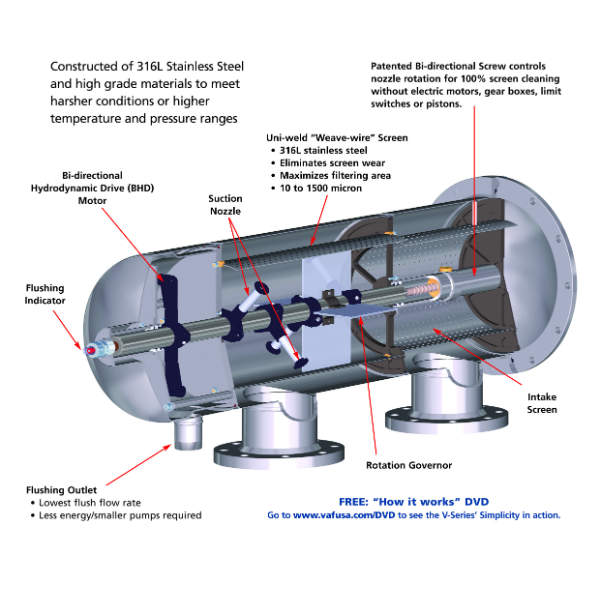 The standard V-Series filters are competitively priced while manufactured in 316L stainless steel. They can also be ordered to meet ASME Pressure Vessel Code requirements (ASME Boiler and Pressure Vessel Code, Section VIII, Division 1) if necessary. In addition, the stainless steel filter bodies come with a five-year body warranty against leaks. The patented Bi-directional Hydrodynamic Drive (BHD) design does not require electric motors, limit switches, gearboxes, hydraulic pistons or any external shaft seals. The cleaning cycle of each filter takes less than 15 seconds and does not interrupt flow during the filtration process.