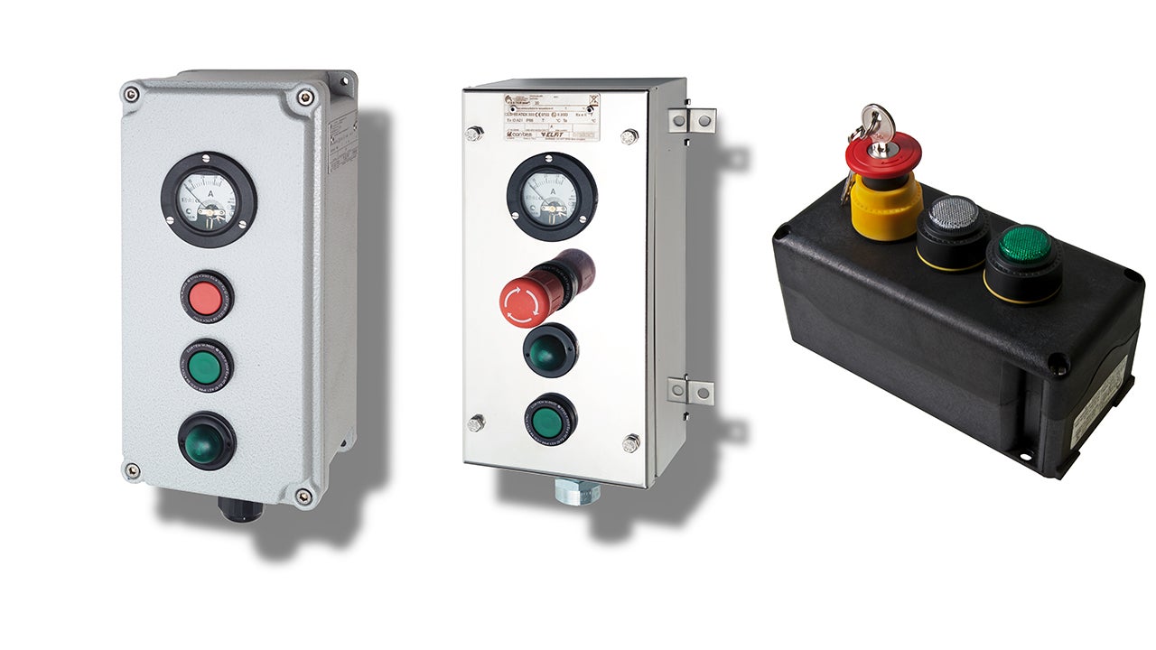 Control stations, command and control operators, signals, electrical circuits and/or motive power switches, limit switches available in ten different models depending on the type of actuator used, grounding equipment. Zone 1, 2, 21, 22.