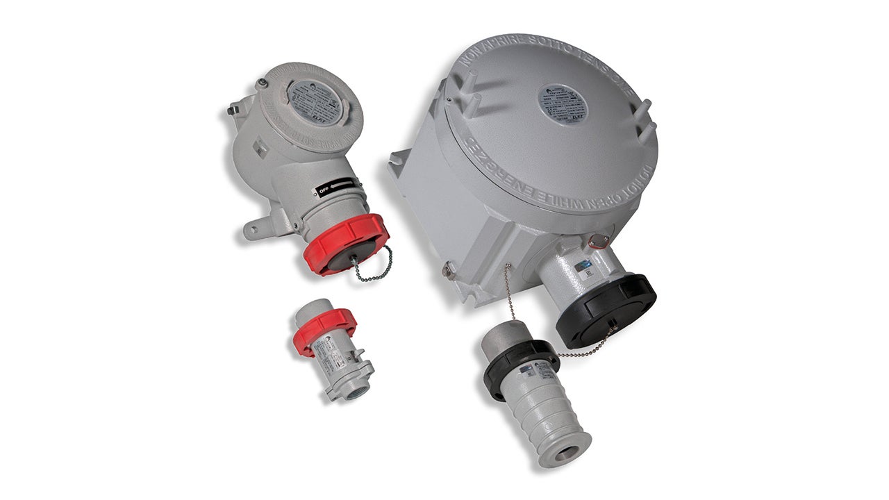 Plugs and Sockets up to 125A with disconnecting interlocked switch. Zone 1, 2, 21, 22.