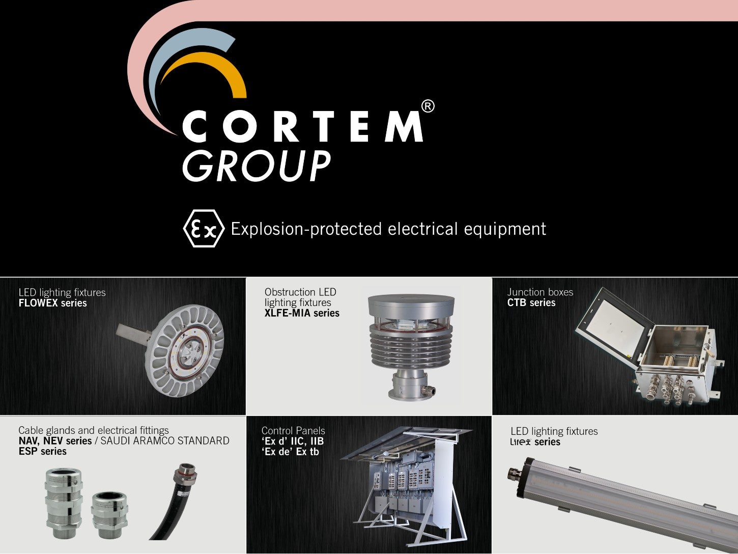 The peculiarity of the Technology Group Cortem, formed by Cortem, Elfit and Fondisonzo, is the experience gained in the Ex-field, which results not only in the furniture of simple Ex-products, but also in engineered and customised solutions. Our products are internally designed and manufactured according to different methods of protection such as ‘Ex db’ flameproof, ‘Ex eb’ increased safety, ‘Ex de’ mixed and ‘Ex nR’ restricted breathing, with the use of primary aluminium alloys, stainless steels and plastic materials that assure resistance and duration.
