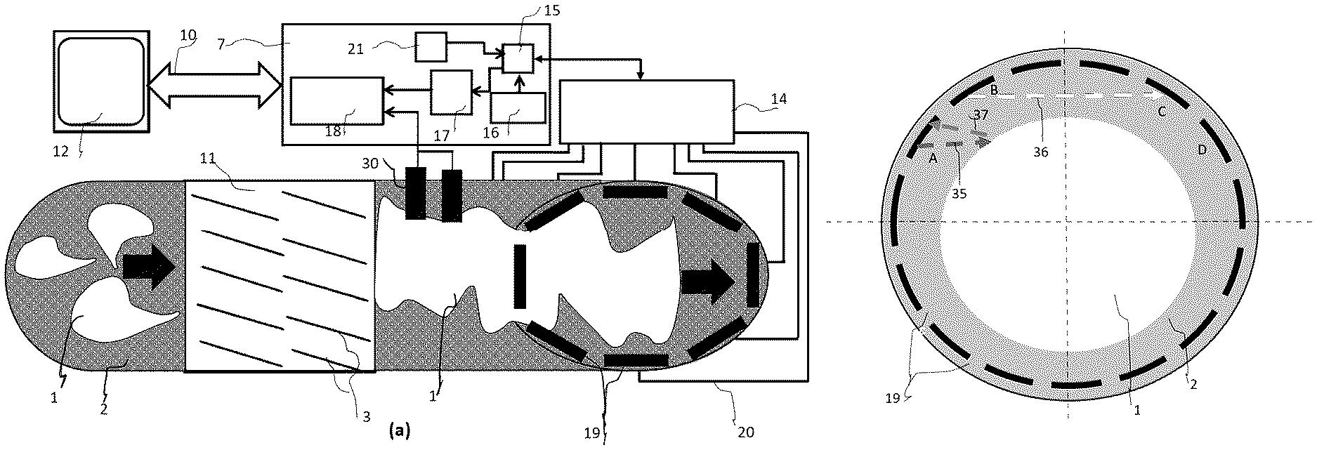 Furthermore, the imaging system may incorporate a THz imaging system to measure gas void fractions above a predefined value, providing additional insights into the multiphase flow. The THz imaging system, comprising a THz source and camera, can capture images reflecting the permittivity of the flow, which are then processed to determine parameters like water-cut, density, and velocity of the liquid-gas interface. The system's versatility is further enhanced by the inclusion of ultrasonic sensors operating in transit time or Doppler-effect mode, pressure sensors for flow rate measurement, and online flow conditioners like swirl separators. Overall, the patent outlines a comprehensive method for analyzing multiphase flows in pipes, offering a valuable tool for industries dealing with complex fluid dynamics.