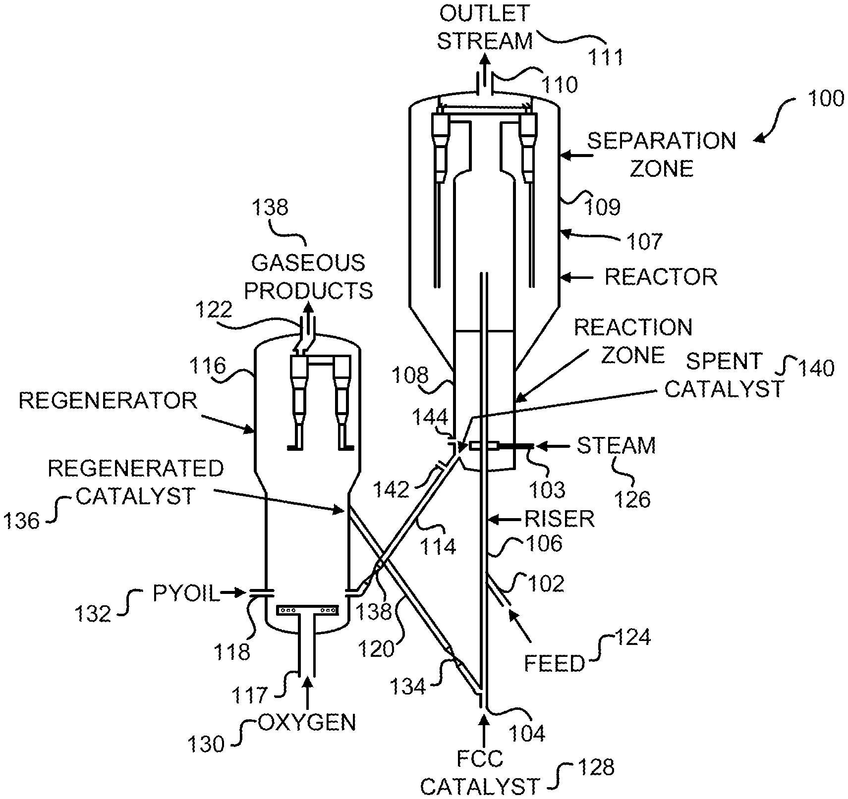 Furthermore, the patent describes a method for processing gas oil in an FCC system, involving mixing the gas oil with steam and an FCC catalyst, cracking the gas oil to produce hydrocarbon products, separating the coked catalyst, and supplying it to the regenerator along with biomass-derived pyrolysis oil. The method includes adjusting the pyrolysis oil amount based on temperature readings to ensure efficient cracking and combustion processes. Additional steps involve introducing the pyrolysis oil at specific locations within the system and maintaining an effective hydrogen index for the oil. Overall, the patent highlights a comprehensive approach to optimizing gas oil processing in an FCC system through controlled biomass-derived pyrolysis oil addition and temperature management.