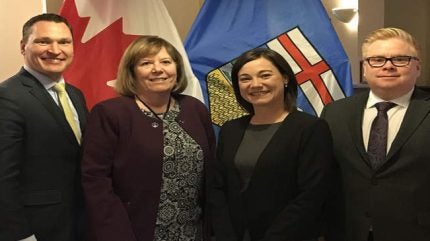 Alberta Minister of Economic Development and Trade Deron Bilous, Minister of Energy Margaret McCuaig-Boyd, Minister of Environment and Parks Shannon Phillips, and Canadian Manufacturers and Exporters vice-president David MacLean.