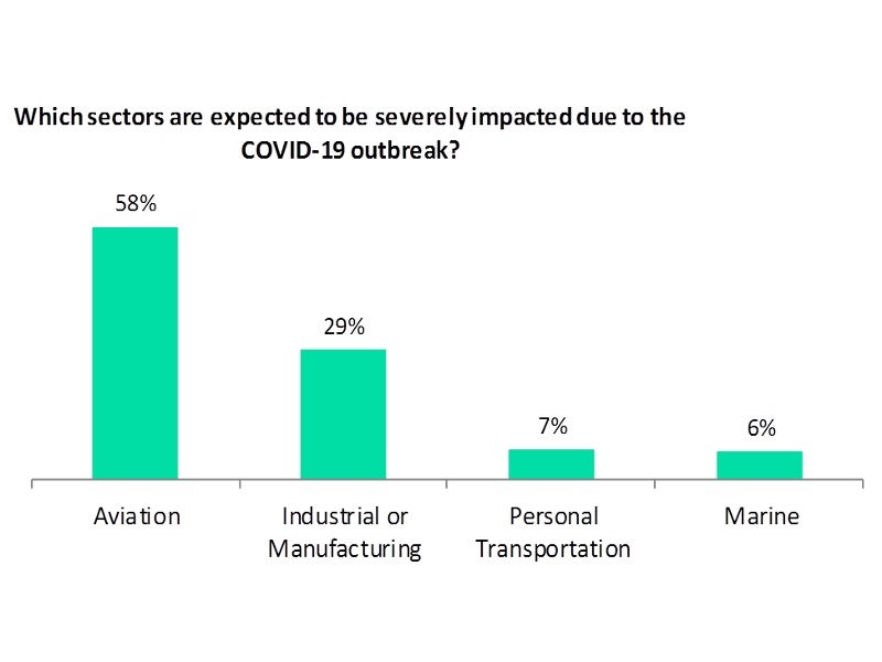 A severe impact on aviation is seen by a majority 58% of the poll respondents. The severity of impact on industrial/manufacturing sector, which consumes approximately 50% of the global energy and feedstock fuels according to BP, is foreseen to be lesser, as chosen by 29% of the poll respondents.