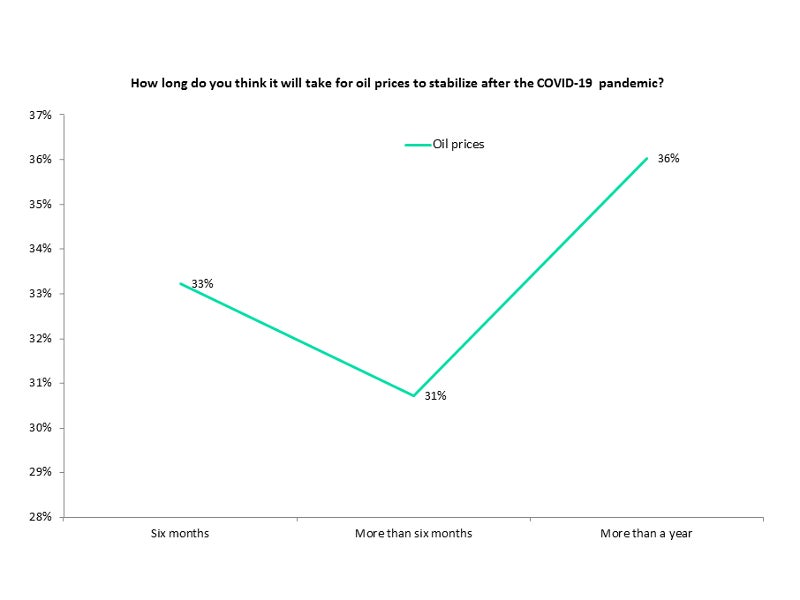 One-third (33%) of the respondents believe that the oil prices won’t be volatile for more than six months following the COVID-19 pandemic.