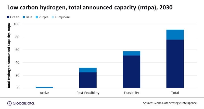 GlobalData’s recent thematic report, “Hydrogen,” reveals that about 83% of the low-carbon hydrogen capacity coming online by 2030 is expected to come from green hydrogen plants, while the remainder is from blue hydrogen.