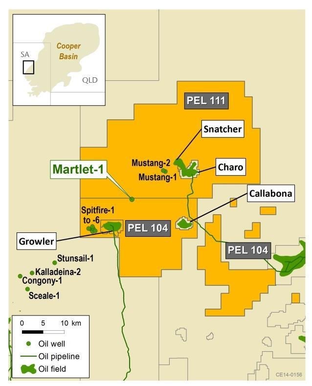 The Martlet-1 exploration well is located in PEL 104 on the western flank of the South Australian Cooper-Eromanga Basin.