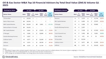 TD Securities and Evercore have emerged as the top mergers and acquisitions (M&A) financial advisers in the oil and gas (O&G) sector for the first quarter of 2025 (Q1 2025), according to GlobalData’s latest financial advisers league table.