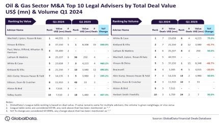 Wachtell, Lipton, Rosen & Katz and White & Case have emerged as the top mergers and acquisitions (M&A) legal advisers in the oil and gas sector during Q1 of 2024 in terms of value and volume, respectively, as per the latest legal advisers league table by GlobalData, a leading data and analytics company.