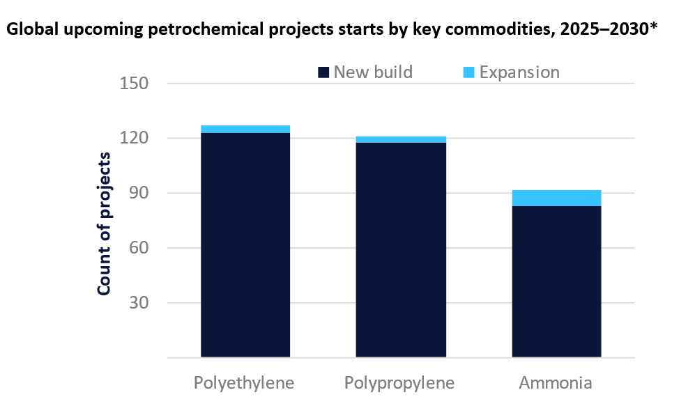 Polyethylene, polypropylene and ammonia are poised to dominate upcoming petrochemical project starts globally by 2030. This can be ascribed to robust economic growth, and escalating demand for these commodities from end‑use sectors such as packaging, automotive, medical, construction and agriculture, especially in countries such as China, India and Iran.