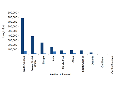 North America will add the highest planned oil and gas pipeline length than any other region in the world over the next four years. The region is expected to witness the construction of more than 60,000km of transmission pipeline length.