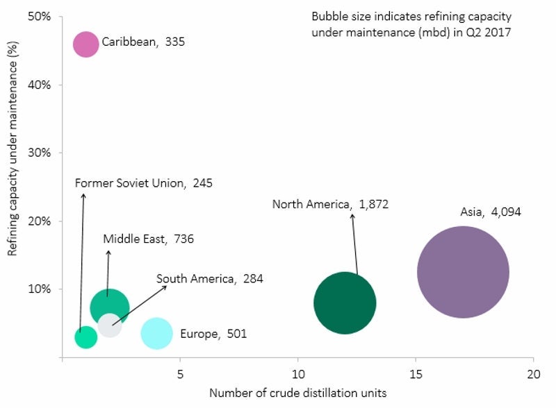 GlobalData’s latest report, ‘Q2 2017 Global Refinery Maintenance Review – India and the US Incur Most Maintenance in the Quarter’ suggests that globally, Asia had the highest refining capacity under maintenance (both planned and unplanned) among all the regions in the second quarter of 2017 with 4,094 thousand barrels per day (mbd). North America (1,872mbd) and the Middle East (736mbd) had the second- and third-highest refining capacities under maintenance, respectively.