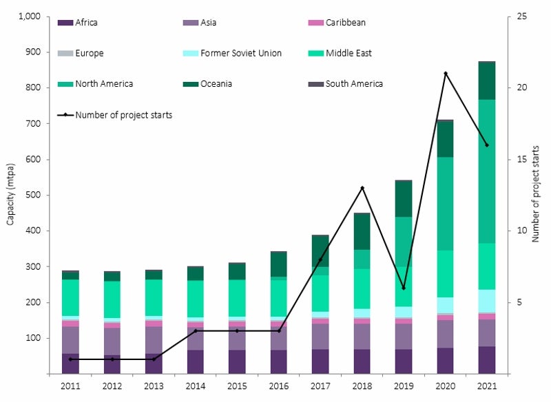 Total liquefaction capacity by region (mtpa). Source: GlobalData.