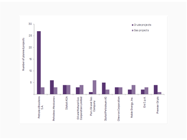 Globally, a total of 279 key planned offshore crude and natural gas projects are expected to start operations in 46 countries. They are expected to contribute around 6,990 mbd to global crude production and about 48 bcfd to global gas production in 2025. Among countries, the highest capex spending is expected to be majorly contributed by Brazil, Mozambique, and the US. About US$586 billion is expected to be spent between 2017 and 2025 to bring the planned projects online. Among companies, Petroleo Brasileiro S.A. would be the highest capex spending company followed by Eni S.p.A. and Royal Dutch Shell plc.