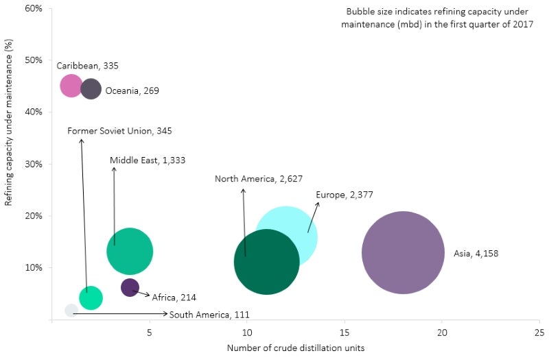 GlobalData’s latest report, ‘Q1 2017 Global Refinery Maintenance Review – Refinery Maintenance Soars in Asia’, indicates that Asia had the highest refining capacity under maintenance among all the regions in the first quarter of 2017 with 4,158 thousand barrels per day (mbd). North America (2,627 mbd) and Europe (2,377 mbd) had the second- and third-highest refining capacities under maintenance, respectively.