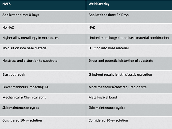 Furthermore, much higher deposition rates, without dilution or needed “butter” / intermediate layers to achieve surface chemistry, make HVTS a better choice over welding applications.